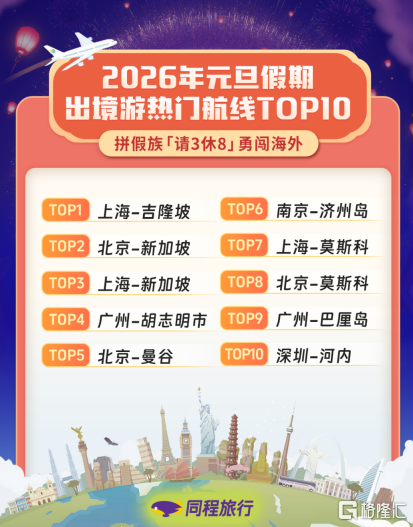 2026元旦跨年迈入倒计时阶段。12月5日,同程旅行发布的《2026元旦假期旅行趋势报告》(下称"报告")显示,近一个月以来,平台上"跨年"、"元旦"等关键词搜索热度环比涨超280%,进入12月份,元旦假期的机票、酒店民宿等主要产品预订逐步起量,整体预订热度较去年同期提升近30%。