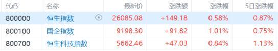 港股三大指数午后持续拉升转涨,全天呈现低开高走的单边行情,市场情绪持续回升。截止收盘,恒生指数涨0.58%再度站上26000点,国企指数、恒生科技指数分别上涨1.01%及0.84%。本周,恒指累涨0.87%,国指累涨0.75%,恒生科技指数累涨1.13%。