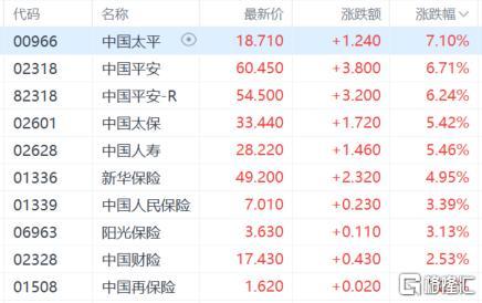 保险股表现活跃,中国太平涨超7%领涨板块,中国平安涨超6%,中国太保、中国人寿涨超5%。