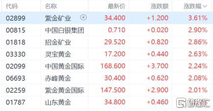 黄金股震荡走高,紫金矿业涨超3%,中国白银集团、招金矿业、灵宝黄金、中国黄金国际涨超2%。