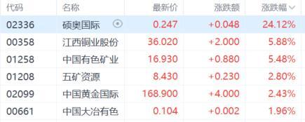 铜业股走高,江西铜业股份、中国有色矿业涨超5%,五矿资源、中国黄金国际涨超2%。