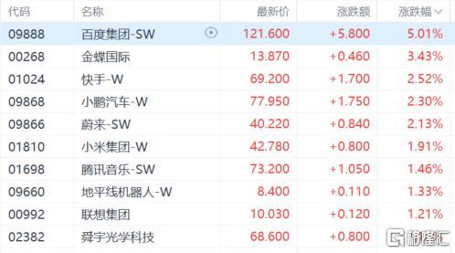 大型科技股多数上涨,百度集团涨超5%,金蝶国际涨超3%,快手、小鹏汽车蔚来涨超2%,小米集团、腾讯音乐等跟涨。