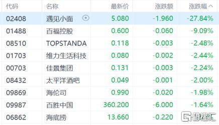 餐饮股走低,遇见小面跌超27%,百福控股跌超9%,海伦司、百胜中国、海底捞等跟跌。