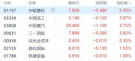 重型机械股继续涨势,中联重科续涨超5%,录得6连升,中国龙工、中国重汽、三一国际涨超3%。