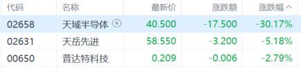 半导体设备与材料股大跌,天域半导体跌超30%,天岳先进跌超5%,普达特科技跌超2%。