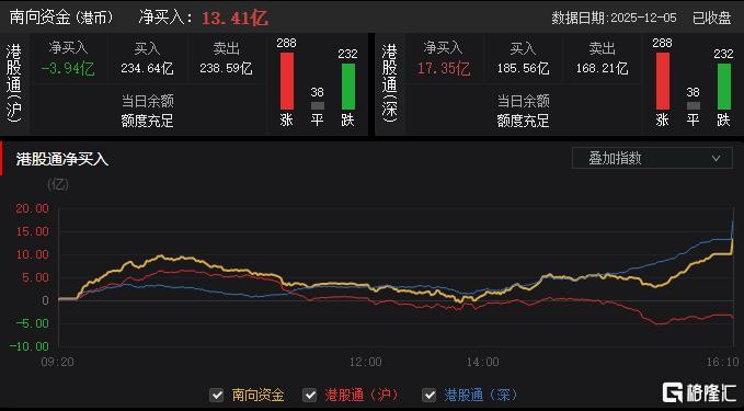 今日,南向资金净买入13.41亿港元,其中港股通(沪)净卖出3.94亿港元,港股通(深)净买入17.35亿港元。