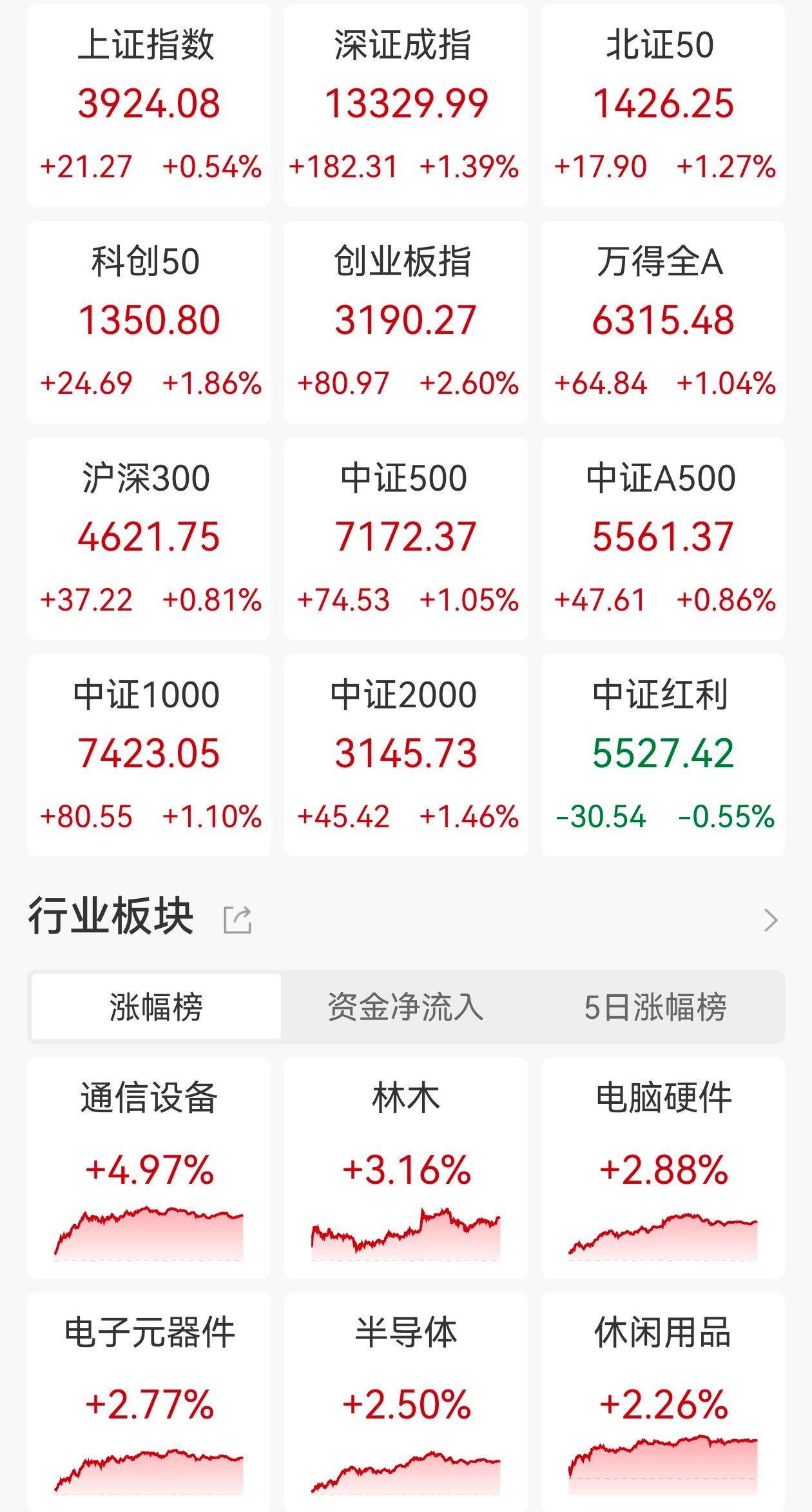重磅会议指明年继续实施更加积极的财政政策和适度宽松的货币政策,A股三大指数今日集体走高,截至收盘,沪指涨0.54%报3924点,深证成指涨1.39%,创业板指涨2.6%。全市场成交额2.05万亿元,较前一交易日增量3127亿元,超3400股上涨。