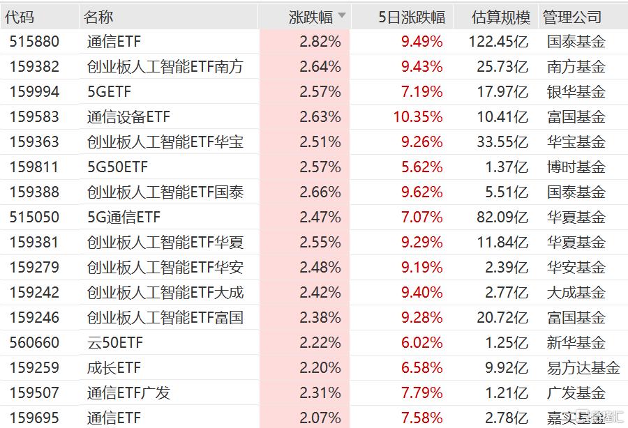 通信ETF、创业板人工智能ETF国泰、创业板人工智能ETF南方、通信设备ETF、创业板人工智能ETF华宝、创业板人工智能ETF华夏、5G50ETF、5GETF、5G通信ETF、创业板人工智能ETF大成、创业板人工智能ETF华安、创业板人工智能ETF富国、通信ETF广发、云50ETF、成长ET、 通信ETF南方涨超2%。