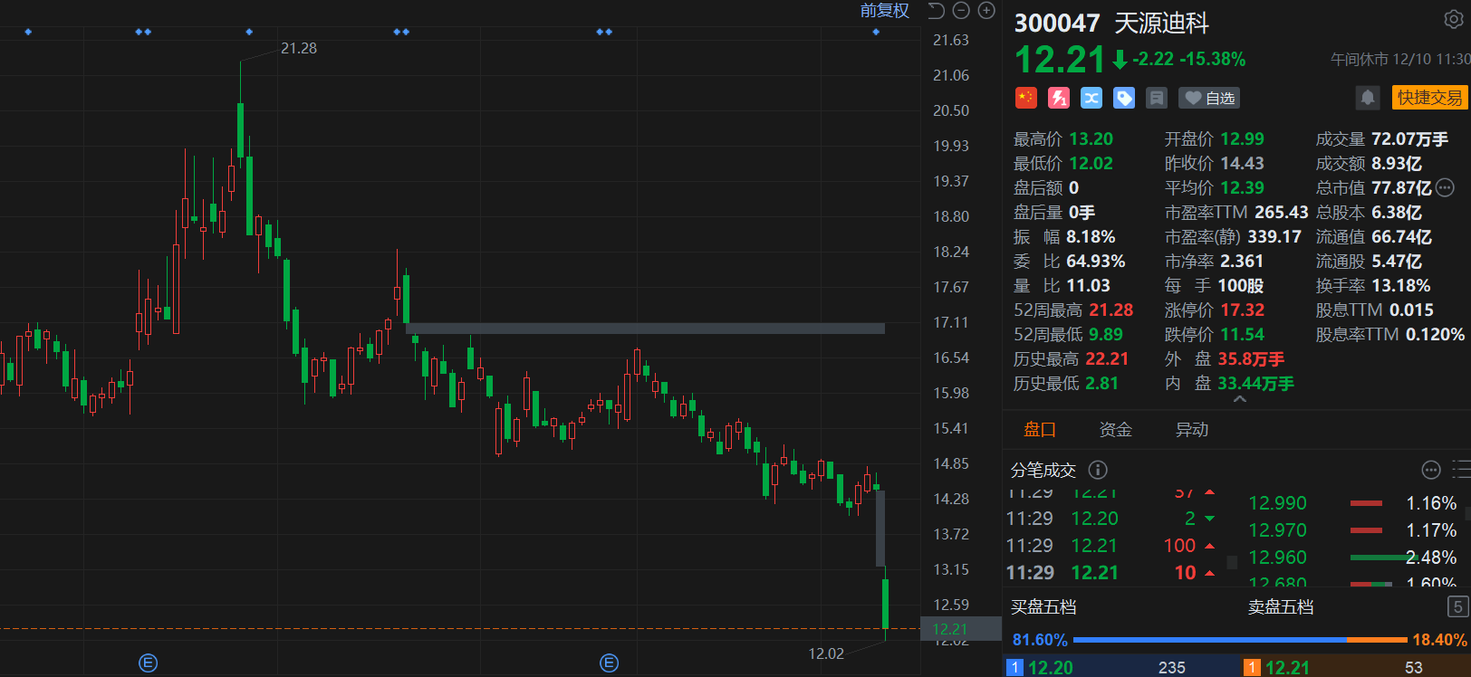 天源迪科(300047.SZ)大幅下跌超15%,跌幅居市场首位,盘中低见12.02元刷新阶段新低,总市值77.87亿元。