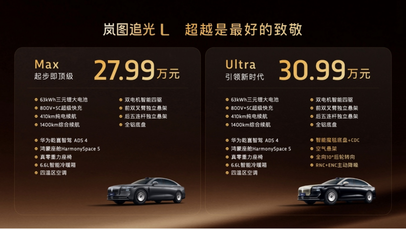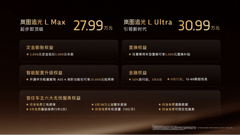 12月10日,新时代旗舰轿车——岚图追光L正式上市,共推出2款版型,售价分别为Max版27.99万元、Ultra版30.99万元。新车同步推出总价值5.2万元的终身免费三电质保、五年免费基础保养等首任车主六大无忧服务权益。