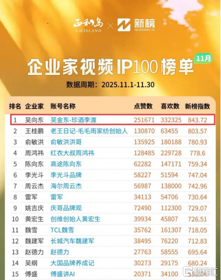 12月9日,正和岛联合新榜发布11月《企业家视频IP 100榜单》,珍酒李渡集团董事长吴向东荣登榜首。