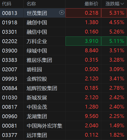 港股内房股盘初拉升上涨,其中,世茂集团、融信中国、万科企业涨超5%,融创中国涨4.5%,绿城中国、雅居乐集团、金辉控股、碧桂园皆涨超3%,旭辉控股、中国金茂、龙湖集团、新城发展涨超2%。
