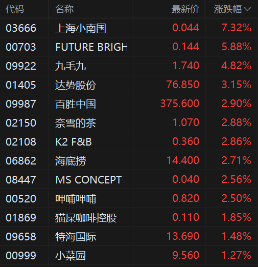 港股餐饮股集体表现活跃,上海小南国涨超7%,九毛九涨近5%,百胜中国、奈雪的茶、海底捞均涨近3%,呷哺呷哺涨2.5%,小菜园、海特国际跟涨。