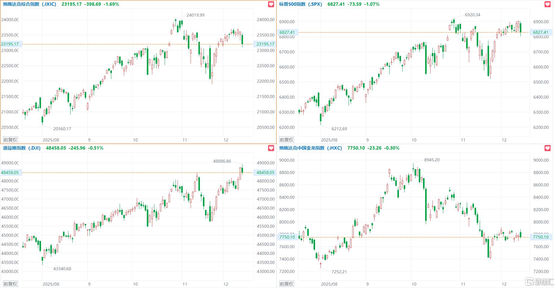美股三大指数集体收跌,道指跌0.51%,纳指跌1.69%,标普500指数跌1.07%。热门科技股普跌,博通跌超11%,英伟达跌超3%,谷歌、微软、Meta、亚马逊均跌超1%,特斯拉涨超2%。
