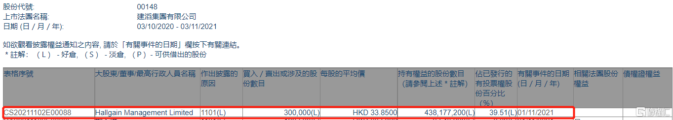 格隆汇APP获悉,根据联交所最新权益披露资料显示,2021年11月1日,建滔集团(00148.HK)获Hallgain Management Limited在场内以每股均价33.85港元增持30万股,涉资约1015.5万港元。
