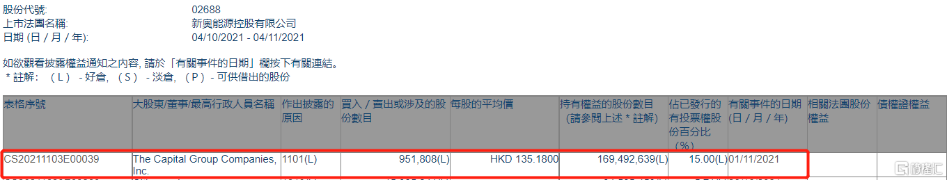 格隆汇APP获悉,根据联交所最新权益披露资料显示,2021年11月1日,新奥能源(02688.HK)获The Capital Group Companies, Inc.在场内以每股均价135.18港元增持95.18万股,涉资约1.29亿港元。