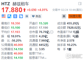 赫兹租车(HTZ.US)逆势涨4%,四季度亏损缩窄