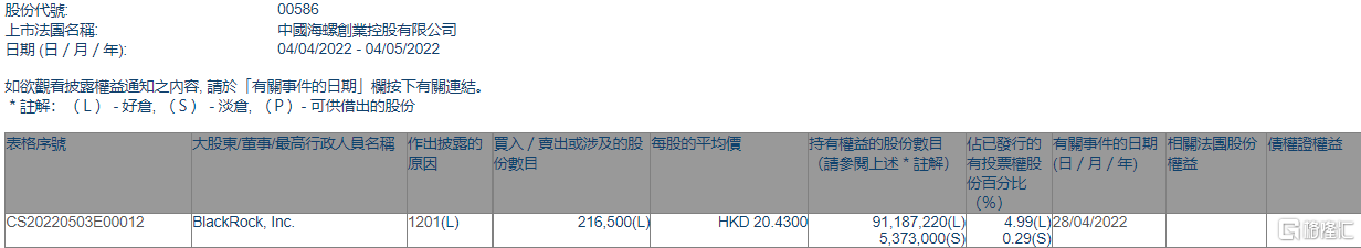 格隆汇APP获悉,根据联交所最新权益披露资料显示,2022年4月28日,海螺创业(00586.HK)遭BlackRock, Inc.在场内以每股均价20.43港元减持好仓21.65万股,涉资约442.31万港元。