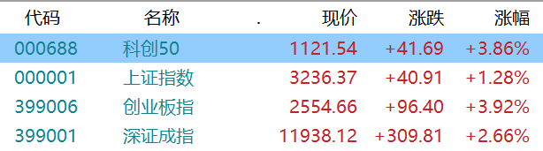沪深两市单边上涨,沪指收涨1.28%报3236点,深成指涨2.66%报11938点,创业板指涨3.92%报2554点,科创50指数涨3.8%报1121点,率先进入技术性牛市。两市3760股上涨,96股涨停,赚钱效应突出,成交量放大,成交额自5月11日以来首次突破万亿,北上资金全天净买入113亿。