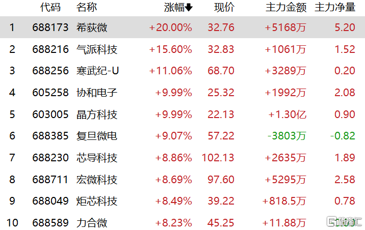半导体板块大涨,希荻微20cm涨停,气派科技涨超15%,协和电子、晶方科技涨停,复旦微电涨超9%,芯导科技、力合微等跟涨。