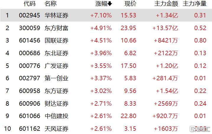 券商股表现活跃,华林证券涨超7%,东方财富、国联证券涨超4%,东北证券、第一创业、广发证券等跟涨。