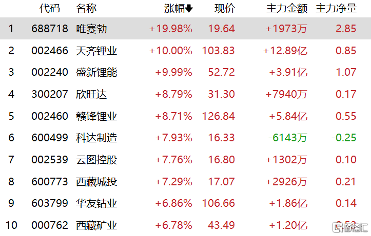 盐湖提锂概念股强势,唯赛勃、天齐锂业、盛新锂能涨停,欣旺达、赣锋锂业涨超8%,科达制造、云图控股、华友钴业等跟涨。