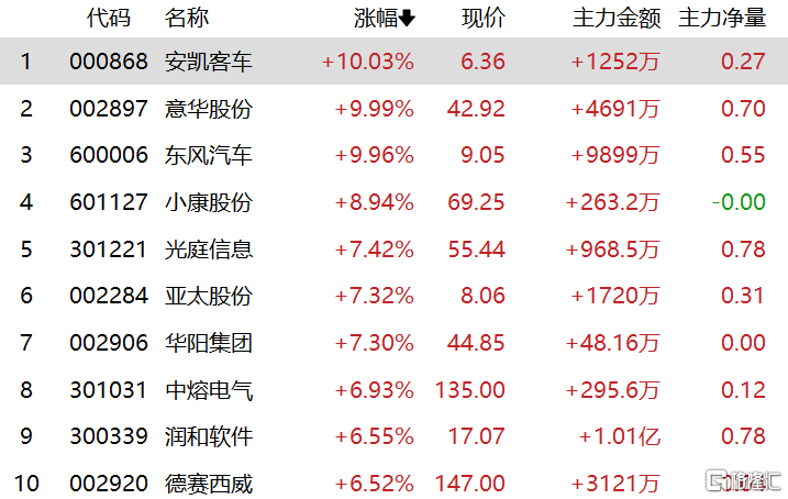 华为汽车、智能驾驶概念表现活跃,安凯客车、意华股份、东风汽车涨停,小康股份涨超8%,光庭信息、德赛西威、润和软件、亚太股份等跟涨。