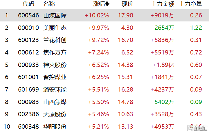 煤炭股持续走强,山煤国际、美丽生态涨停,兰花科创涨超9%,晋控煤业、山西焦煤、潞安环能等跟涨。