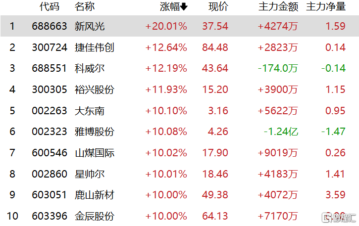 光伏板块表现强劲,新风光20cm涨停,捷佳伟创、科威尔涨超12%,裕兴股份涨超11%,大东南、雅博股份,金辰股份等多股涨停。
