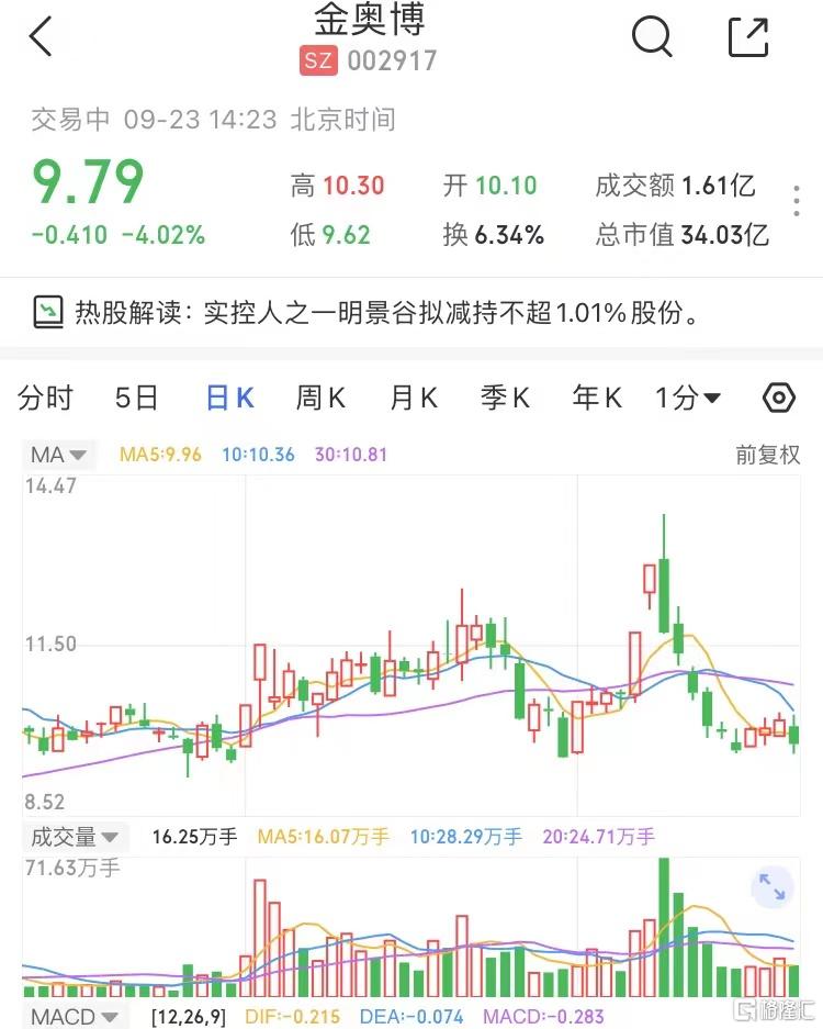 格隆汇9月23日丨金奥博(002917.SZ)现跌4.02%报9.79元,暂成交1.6亿元,最新市值34亿元。金奥博昨日晚间公布,公司持股5%以上股东、实际控制人之一明景谷拟通过大宗交易方式减持其持有的公司股份不超过350万股,即不超过公司总股本的1.01%;减持期间为减持计划公告披露之日起3个交易日后的6个月内。