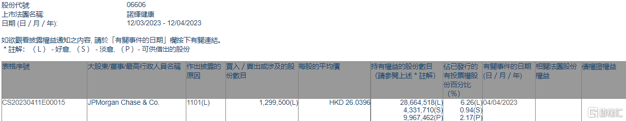 格隆汇4月12日丨根据联交所最新权益披露资料显示,2023年4月4日, 诺辉健康-B(06606.HK)获JPMorgan Chase & Co.以每股均价26.0396港元增持好仓129.95万股,涉资约3383.85万港元。